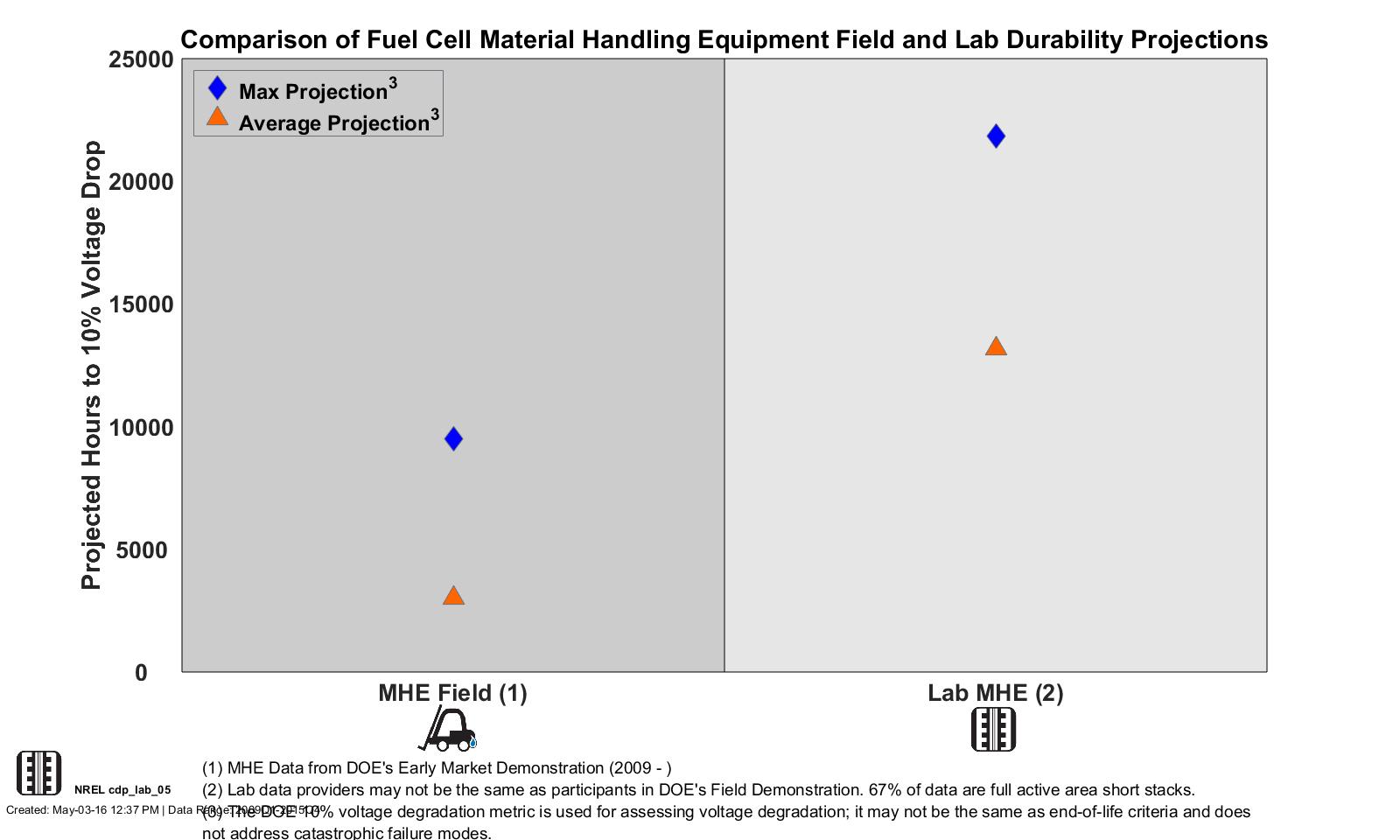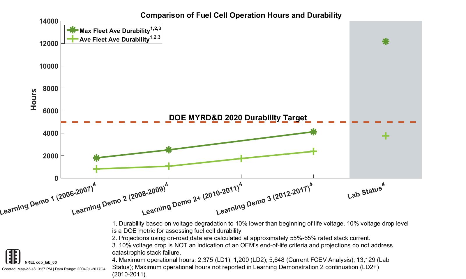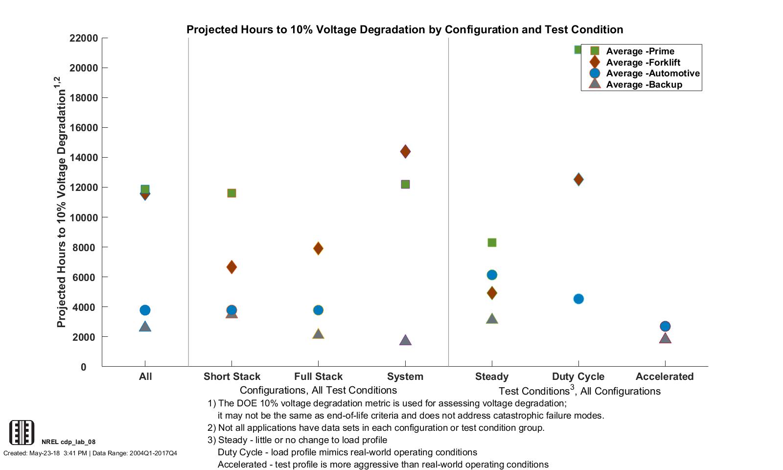 Lab Data Hours Accumulated and Projected Hours to 10% Stack Voltage Degradation (2014–2017 Data)