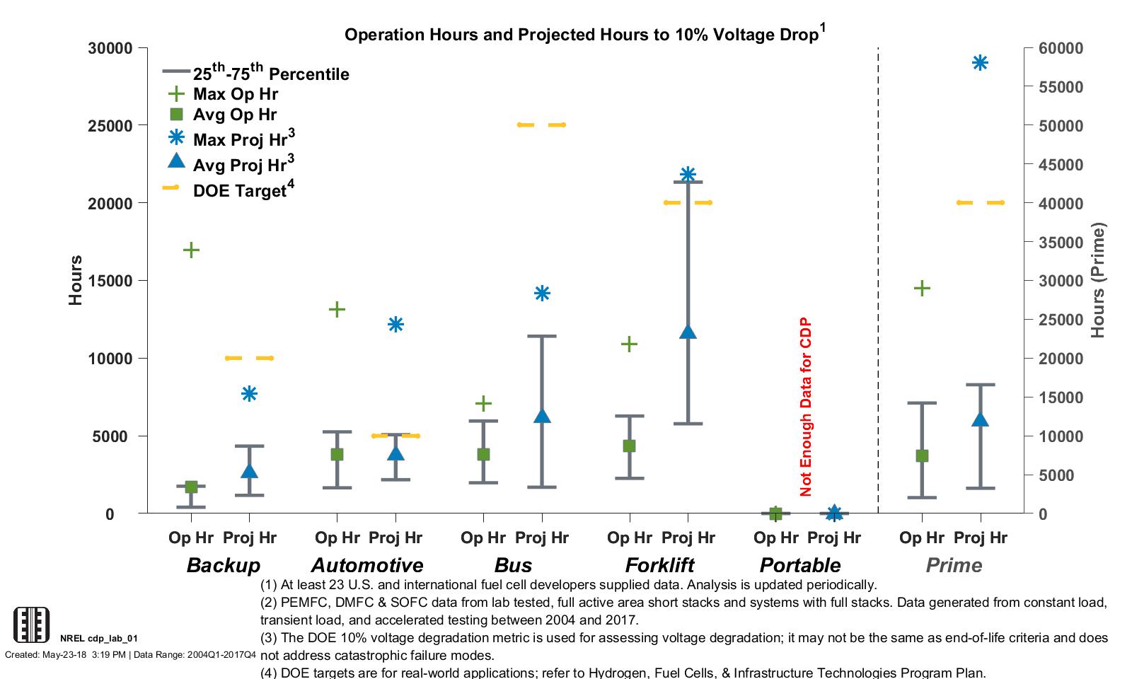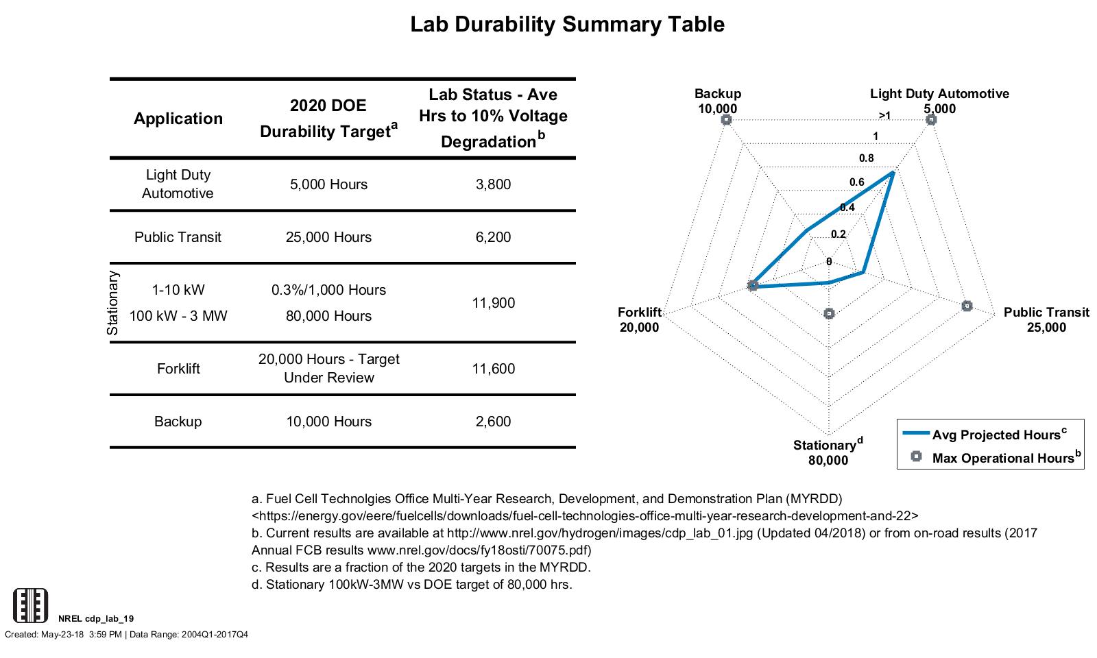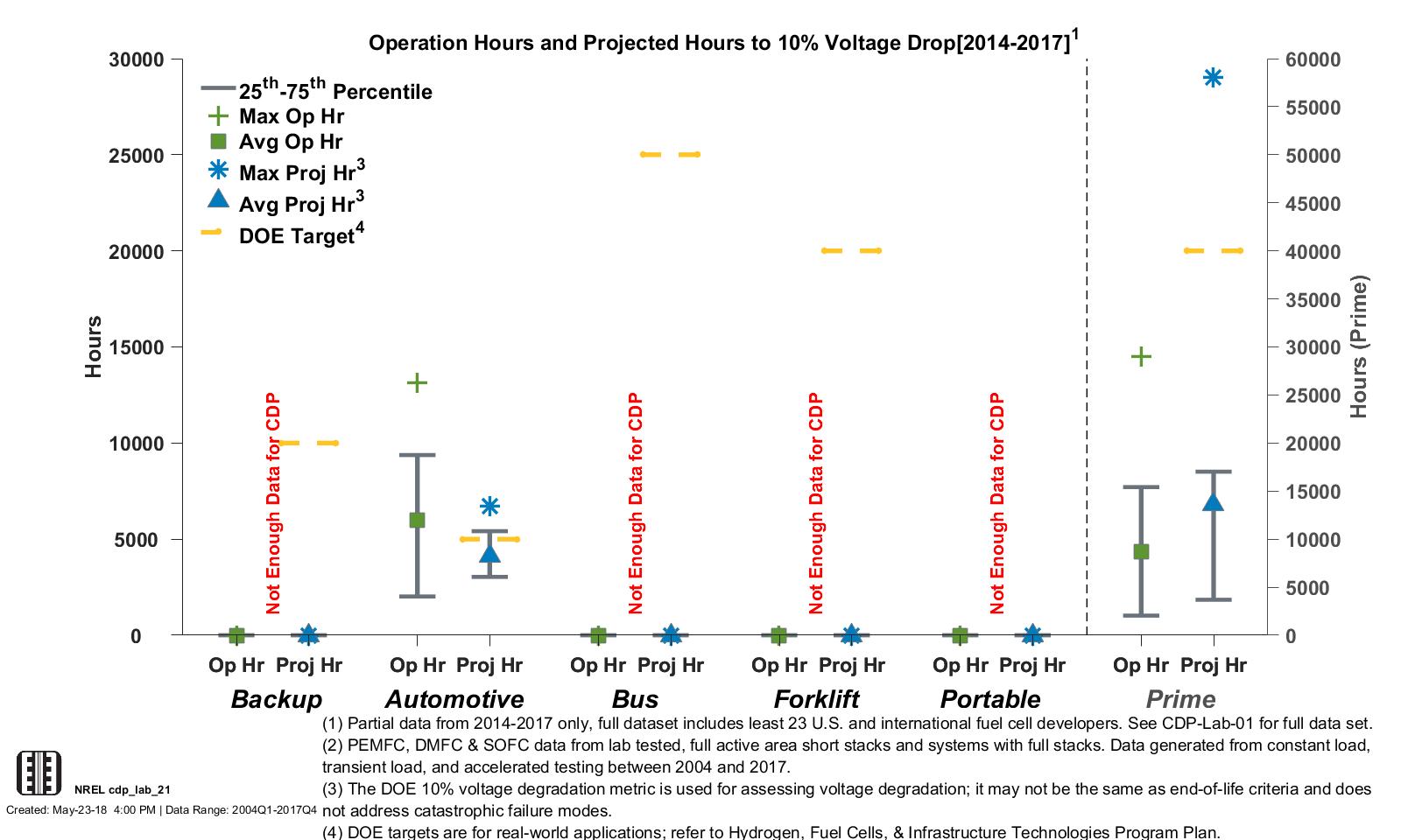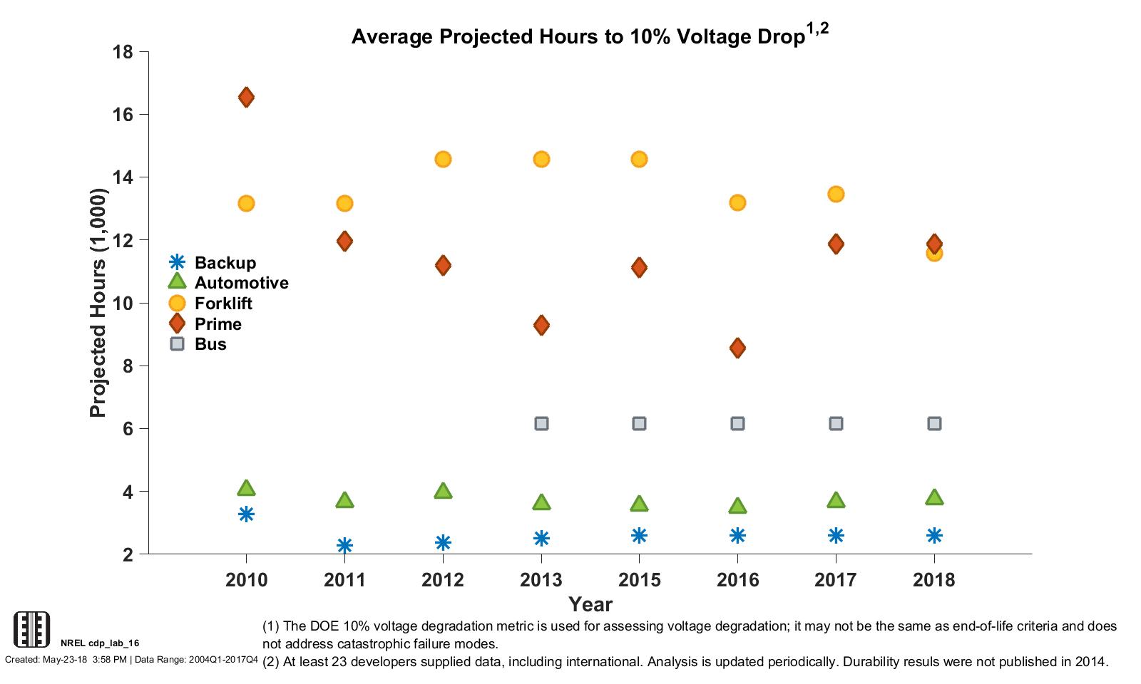 Lab Data Hours Accumulated and Projected Hours to 10% Stack Voltage Degradation (2014–2017 Data)