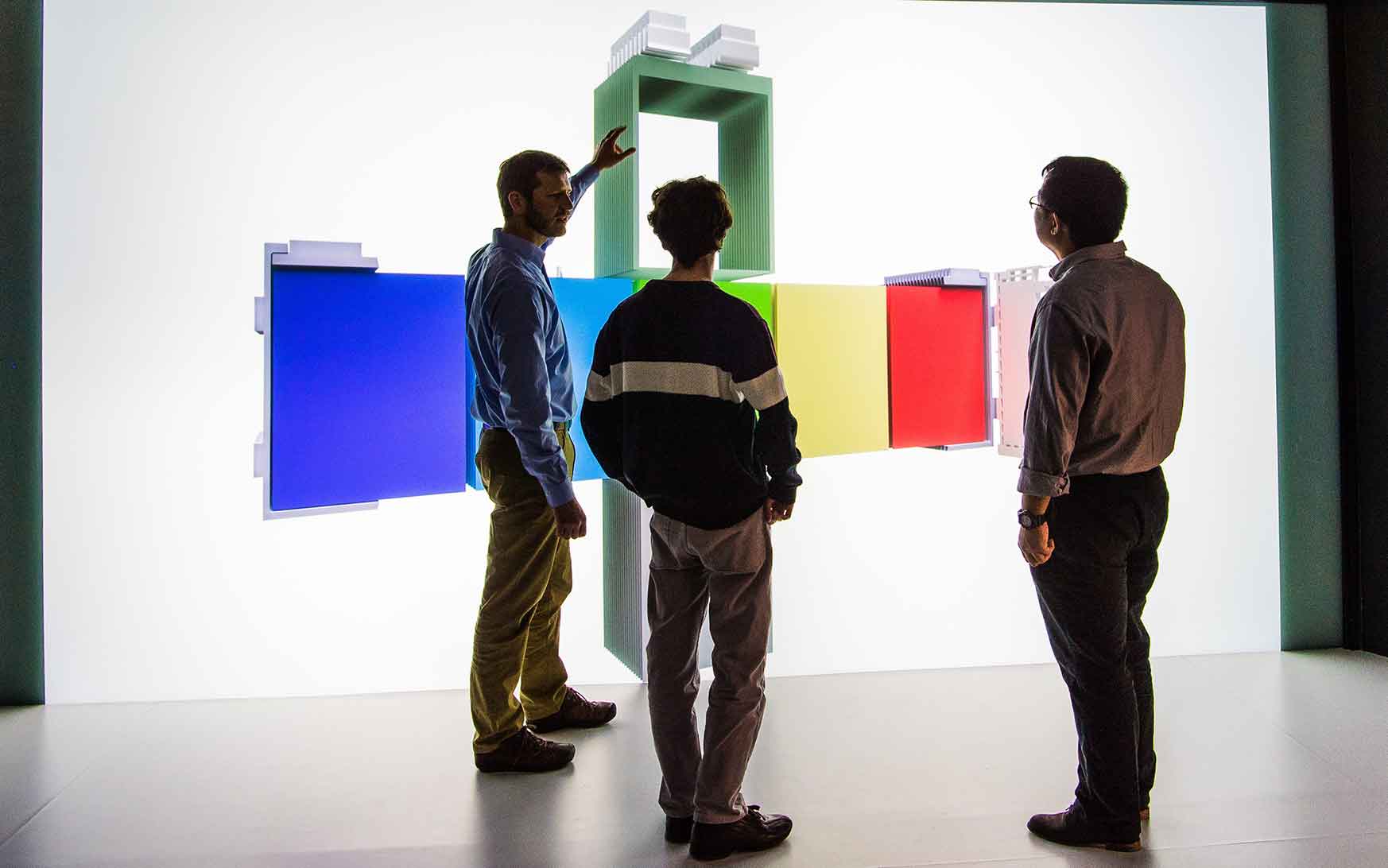 NREL energy storage researchers Kandler Smith and Chuanbo Yang, along with postdoctoral researcher Francois Usseglio-Viretta, evaluate a simulation still of Li-ion battery components in the Energy Systems Integration Facility’s 3-D visualization room. Photo by Dennis Schroeder, NREL 41705