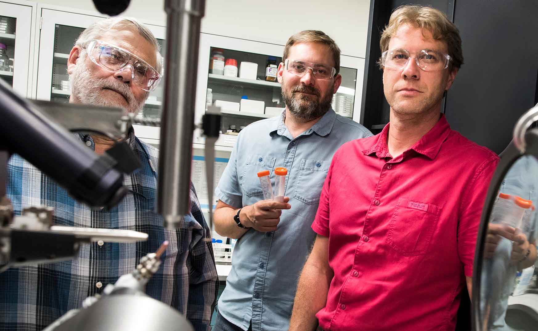 NREL scientists Michael Himmel (left), Roman Brunecky, and Yannick Bomble with the X-ray diffraction source used to determine the structure of the C. bescii CelA cellulase. (Dennis Schroeder/NREL)