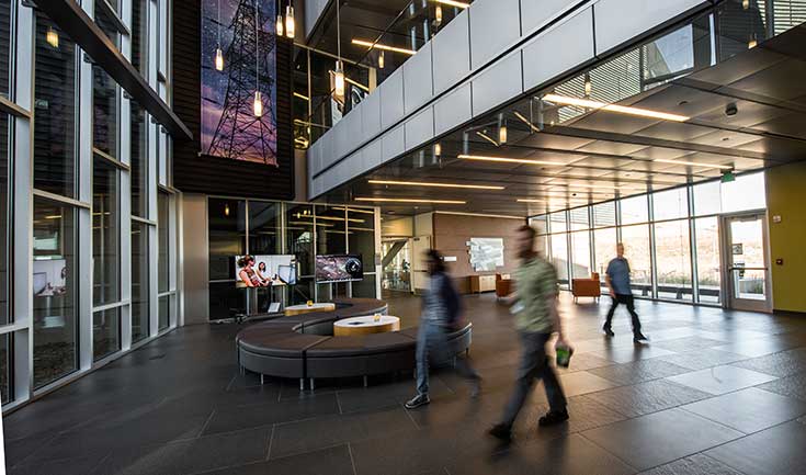 In fact, most new buildings on NREL's campus are LEED Gold or Platinum certified, from the guard buildings at the gates, to the parking garage and the cafeteria, to various lab buildings. The ESIF, which NREL constructed after the RSF, again shifted the paradigm. At the time of its construction, ESIF's data center led the way, with efficiency technologies enabling a nearly one-to-one power usage effectiveness (1.03-1.06 PUE today), with live PUE dashboard—virtually unheard of at the time. A PUE of 1.0 means all energy goes to computer power, with no energy used for cooling. PUE of 1.5 to 2.0 is typical for other supercomputers and data centers. Since construction of the ESIF, other big companies, such as Amazon, also have adopted and incorporated these NREL devised technologies.